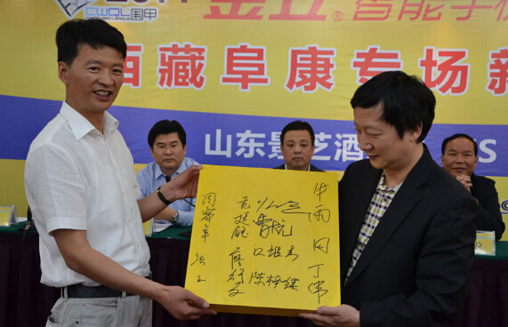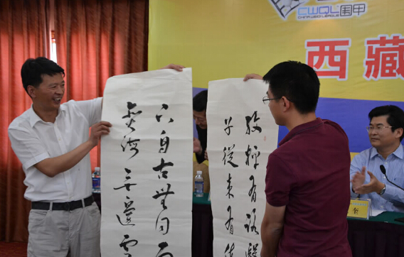 發(fā)布會最后曹大元九段代表兩隊(duì)棋手像王斌贈送國手簽名的棋盤,王斌則用三幅字回贈兩隊(duì)。