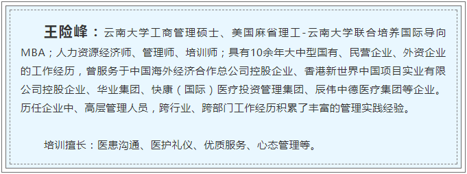 王險(xiǎn)峰以“為什么來培訓(xùn)”開題,對(duì)本次培訓(xùn)的目的與意義進(jìn)行了說明,調(diào)動(dòng)了在場(chǎng)員工學(xué)習(xí)積極性。接下來他對(duì)“規(guī)范醫(yī)療”、“安全醫(yī)療”、“效率醫(yī)療”、“溫度醫(yī)療”四種醫(yī)療模式進(jìn)行區(qū)別解讀,以加深員工對(duì)“優(yōu)質(zhì)醫(yī)療服務(wù)”的理解。王險(xiǎn)峰介紹,北京市朝陽區(qū)桓心腫瘤醫(yī)院院長(zhǎng)丁劍曾說“無溫度,不醫(yī)療。溫度醫(yī)療是整個(gè)非公醫(yī)療行業(yè)的出路”,阜康作為民營(yíng)醫(yī)療機(jī)構(gòu),開展“溫度醫(yī)療”,提供“優(yōu)質(zhì)服務(wù)”是發(fā)展壯大的重要途徑。接下來他就如何營(yíng)造“溫度醫(yī)療”進(jìn)行展開論述,分別從“什么是服務(wù)和優(yōu)質(zhì)服務(wù)”、“職業(yè)化態(tài)度與服務(wù)能力”、“與患者家屬建立良好關(guān)系”、“語言和非語言能力及傾聽能力”、“談判技巧與化解沖突能力”、“禮儀行為規(guī)范”六個(gè)方面進(jìn)行闡釋。