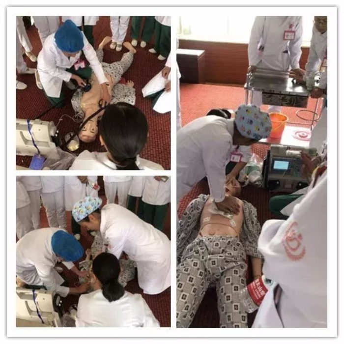 護理部主任王青青、兒科周玲護士長及產(chǎn)科二病區(qū)代理護士長李艷三人配合進行了心肺復蘇除顫操作技術。本次講課內容豐富并貼近實際工作,老師現(xiàn)場操作演示護理技術,護理人員積極互動,各科室分別派出三人進行了實操演練,在老師的指導下熟悉了流程并掌握了重點步驟。